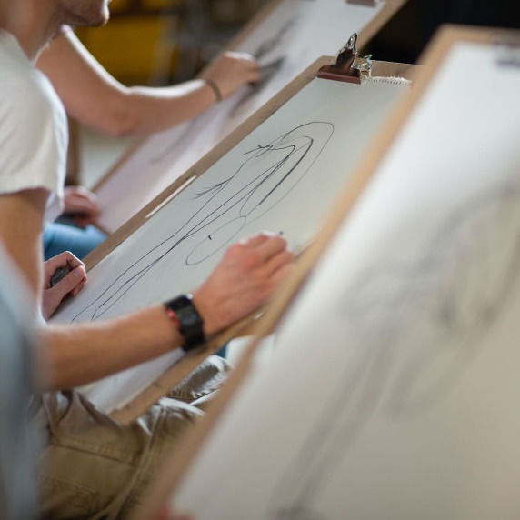 Classrooms are equipped with drafting tables and easels.